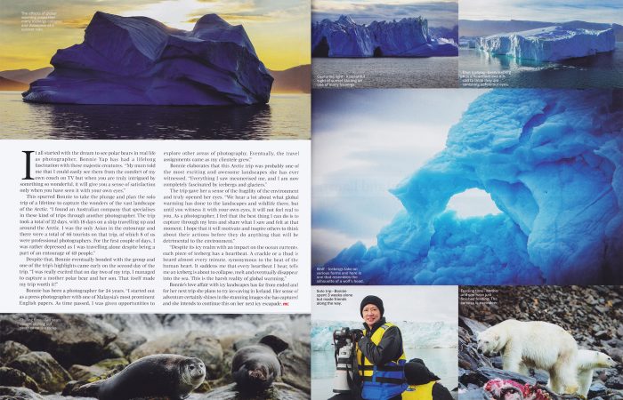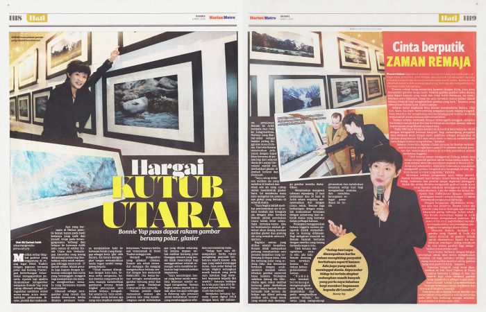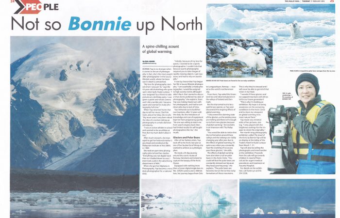 In 2016, Bonnie conducted her second photo exhibition of photos taken during her 2015 jaunt to Antartica. The exhibition was in conjunction with World Environment Day, and raised funds for the Liter of Light project which is an international humanitarian movement bringing renewable light to energy poverty areas. Part of the proceeds also went to fund surgery for a needy infant at Institut Jantung Negara.